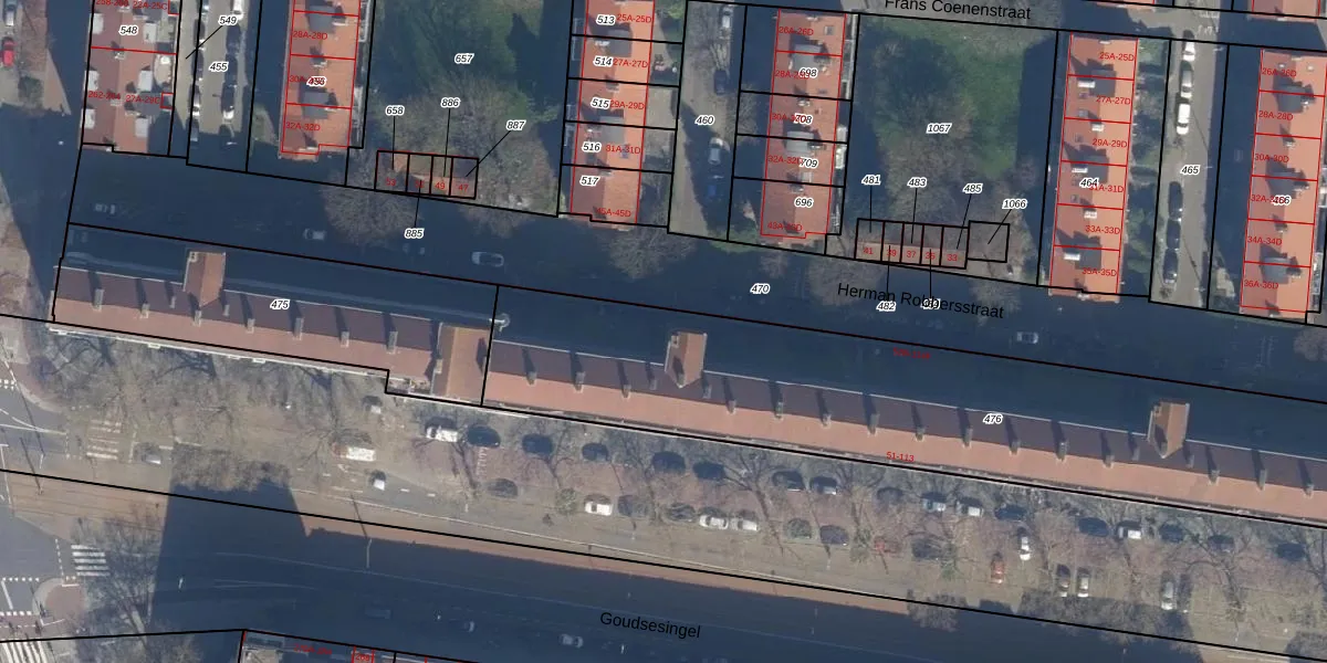Het adres is gelegen op perceel 476 in de sectie AE en de kadastrale gemeente Rotterdam. De kadastrale aanduiding is aldus RTD04-AE-476. De gemiddelde perceeloppervlakte in de kadastrale gemeente Rotterdam is 1239,97 m². Dit perceel is met zijn 3162 m² dus groter dan gemiddeld. Het grootste perceel in de kadastrale gemeente is 17,3 ha. Het kleinste perceel heeft een oppervlakte van 0 m². Er zijn 134 adressen aanwezig op het perceel. De huidige grenzen van het perceel zijn digitaal in de Basisregistratie Kadaster (BRK) geregistreerd op 20-01-2003.