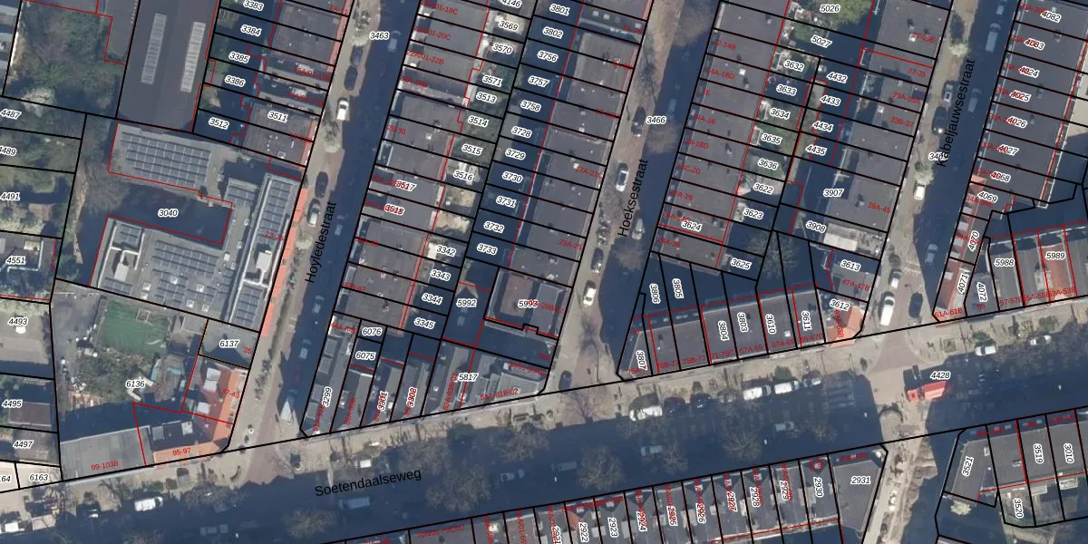 Het perceel waarop Hoeksestraat 23-B staat heeft een oppervlakte van 97 m². Dit is een klein perceel. De perceeloppervlakte wordt geregistreerd door het Kadaster. Gedetailleerde informatie over de maten van dit perceel kunt u vinden in het rapport Kadastrale kaart met maatvoering van Hoeksestraat 23-B.