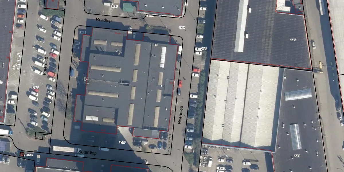 Hoendiep 14 is gelegen op kadastraal perceel RTD05V3523. Deze kadastrale aanduiding is uniek en wordt gebruikt door het Kadaster om eigendomsrechten en andere zakelijke rechten vast te leggen. Het perceel maakt onderdeel uit van de kadastrale gemeente Rotterdam.