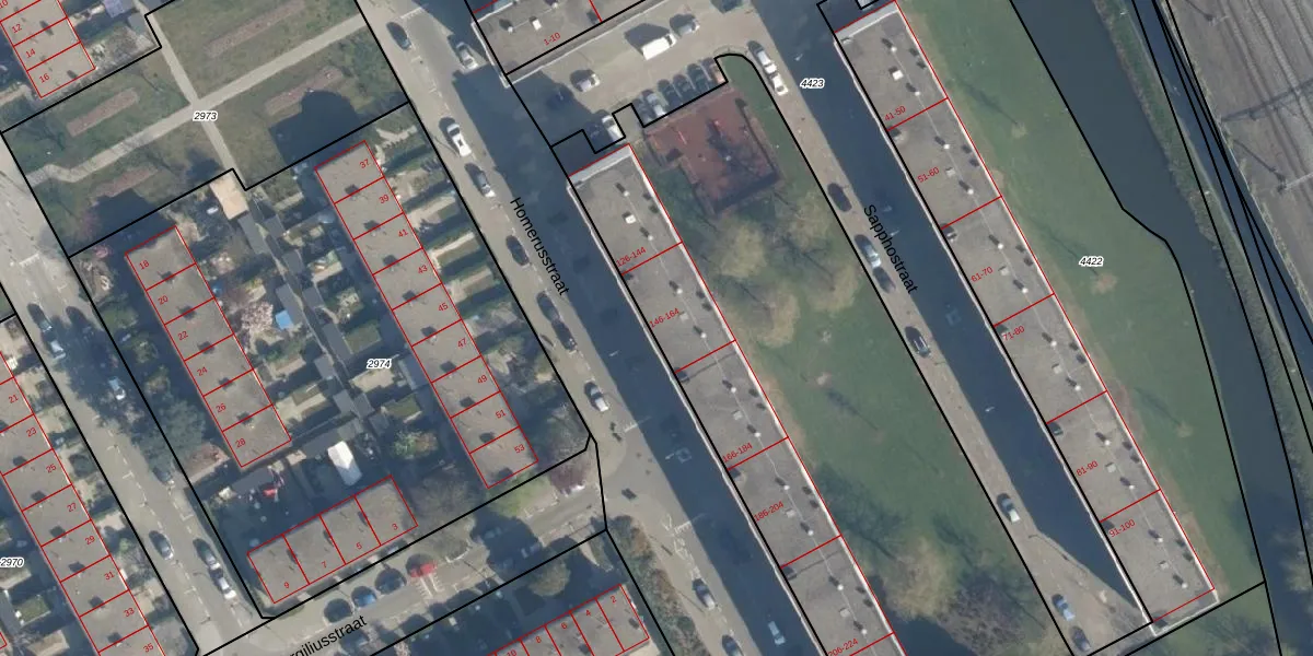 Het perceel waarop Homerusstraat 150 staat heeft een oppervlakte van 7525 m². Dit is een zeer groot perceel. De perceeloppervlakte wordt geregistreerd door het Kadaster. Gedetailleerde informatie over de maten van dit perceel kunt u vinden in het rapport Kadastrale kaart met maatvoering van Homerusstraat 150.