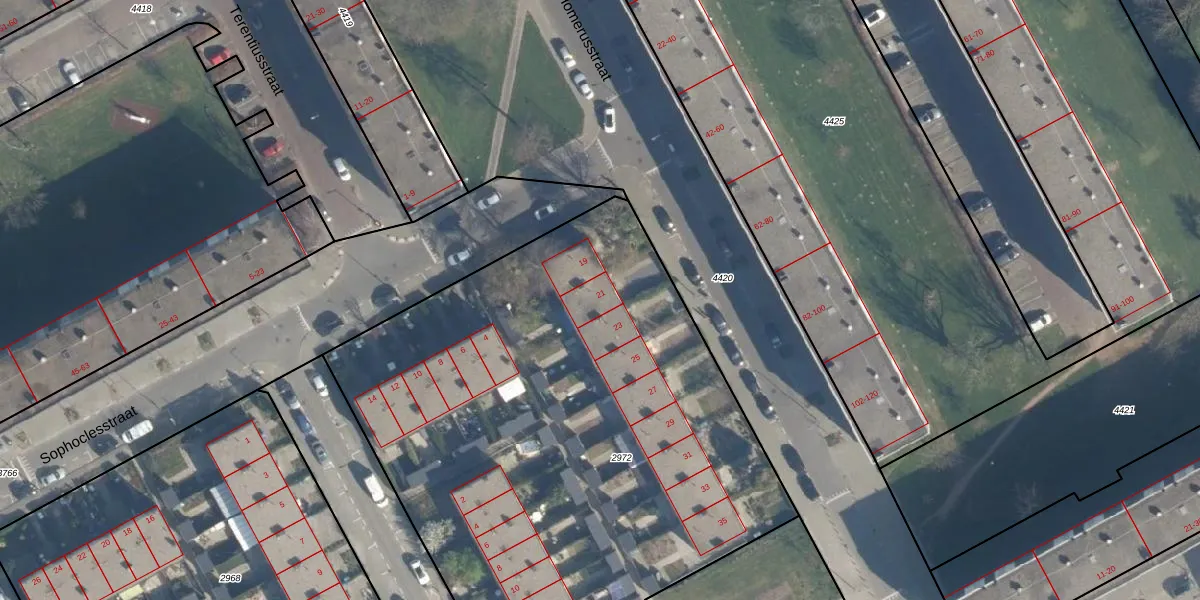 Het perceel waarop Homerusstraat 21 staat heeft een oppervlakte van 3677 m². Dit is een zeer groot perceel. De perceeloppervlakte wordt geregistreerd door het Kadaster. Gedetailleerde informatie over de maten van dit perceel kunt u vinden in het rapport Kadastrale kaart met maatvoering van Homerusstraat 21.