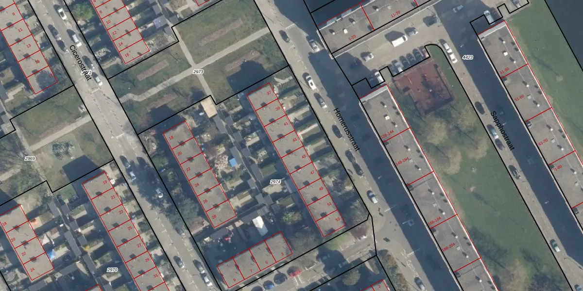 Het perceel waarop Homerusstraat 43 staat heeft een oppervlakte van 3513 m². Dit is een zeer groot perceel. De perceeloppervlakte wordt geregistreerd door het Kadaster. Gedetailleerde informatie over de maten van dit perceel kunt u vinden in het rapport Kadastrale kaart met maatvoering van Homerusstraat 43.