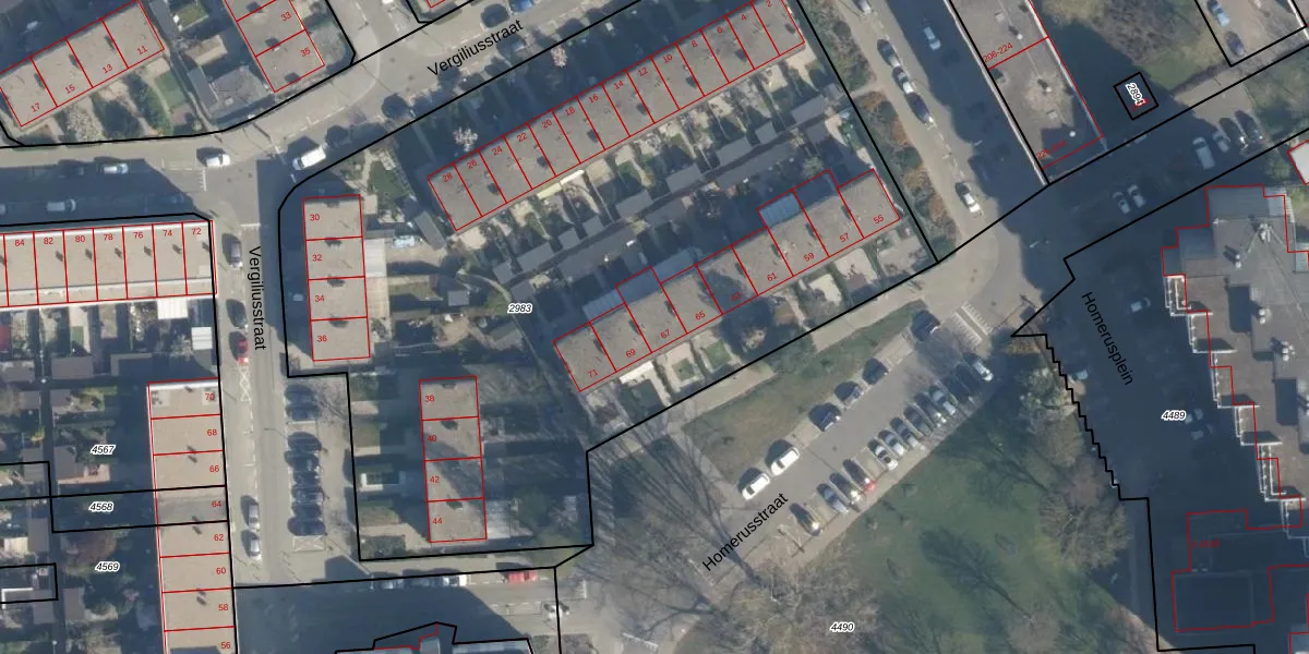 Het perceel waarop Homerusstraat 67 staat heeft een oppervlakte van 5448 m². Dit is een zeer groot perceel. De perceeloppervlakte wordt geregistreerd door het Kadaster. Gedetailleerde informatie over de maten van dit perceel kunt u vinden in het rapport Kadastrale kaart met maatvoering van Homerusstraat 67.