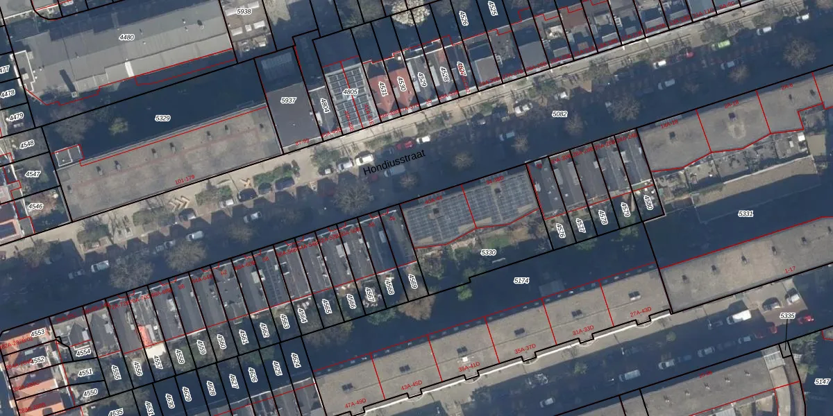 Het perceel waarop Hondiusstraat 44 staat heeft een oppervlakte van 719 m². Dit is een groot perceel. De perceeloppervlakte wordt geregistreerd door het Kadaster. Gedetailleerde informatie over de maten van dit perceel kunt u vinden in het rapport Kadastrale kaart met maatvoering van Hondiusstraat 44.