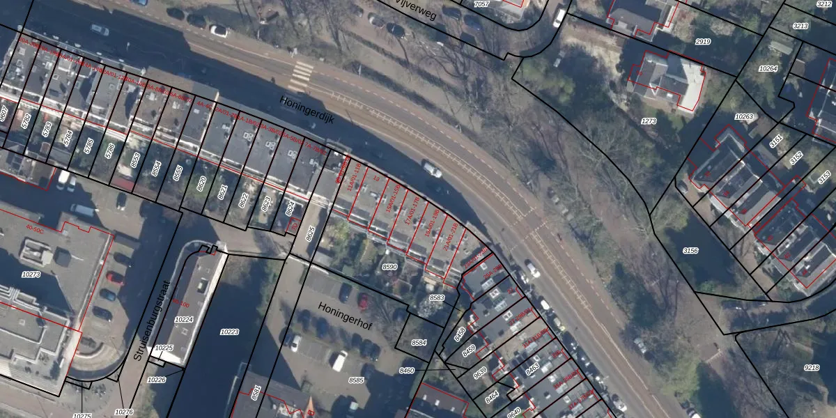 Honingerdijk 17-A-02 is gelegen op kadastraal perceel KLG00D8590. Deze kadastrale aanduiding is uniek en wordt gebruikt door het Kadaster om eigendomsrechten en andere zakelijke rechten vast te leggen. Het perceel maakt onderdeel uit van de kadastrale gemeente Kralingen.