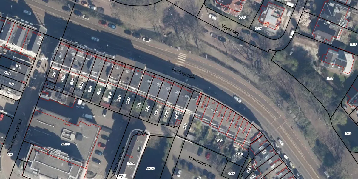 Honingerdijk 5-A is gelegen op kadastraal perceel KLG00D8623. Deze kadastrale aanduiding is uniek en wordt gebruikt door het Kadaster om eigendomsrechten en andere zakelijke rechten vast te leggen. Het perceel maakt onderdeel uit van de kadastrale gemeente Kralingen.