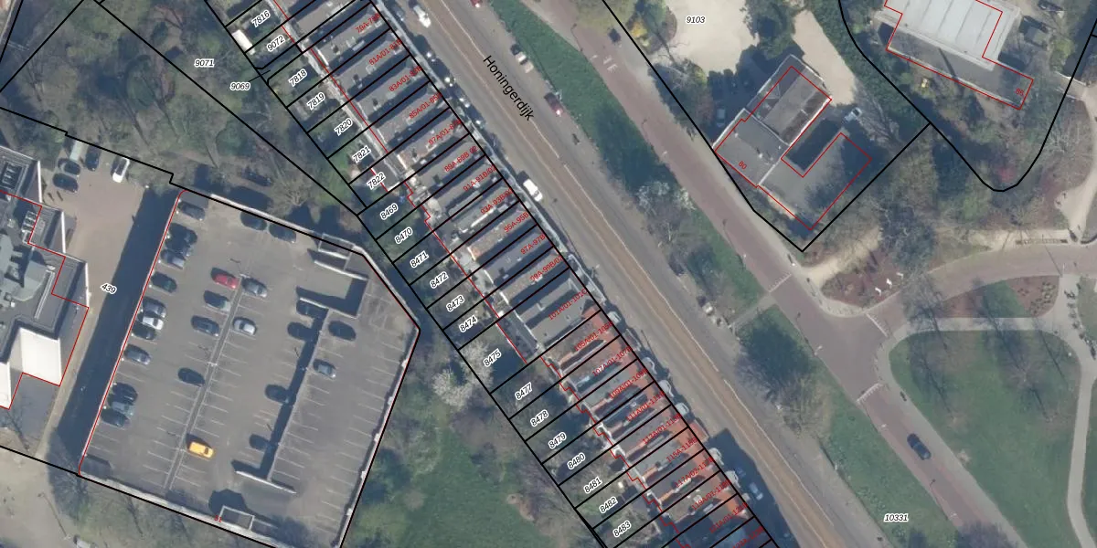 Honingerdijk 99-A is gelegen op kadastraal perceel KLG00D8474. Deze kadastrale aanduiding is uniek en wordt gebruikt door het Kadaster om eigendomsrechten en andere zakelijke rechten vast te leggen. Het perceel maakt onderdeel uit van de kadastrale gemeente Kralingen.