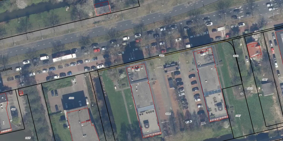 Het perceel waarop Hoofdweg 258-78 staat heeft een oppervlakte van 6080 m². Dit is een zeer groot perceel. De perceeloppervlakte wordt geregistreerd door het Kadaster. Gedetailleerde informatie over de maten van dit perceel kunt u vinden in het rapport Kadastrale kaart met maatvoering van Hoofdweg 258-78.