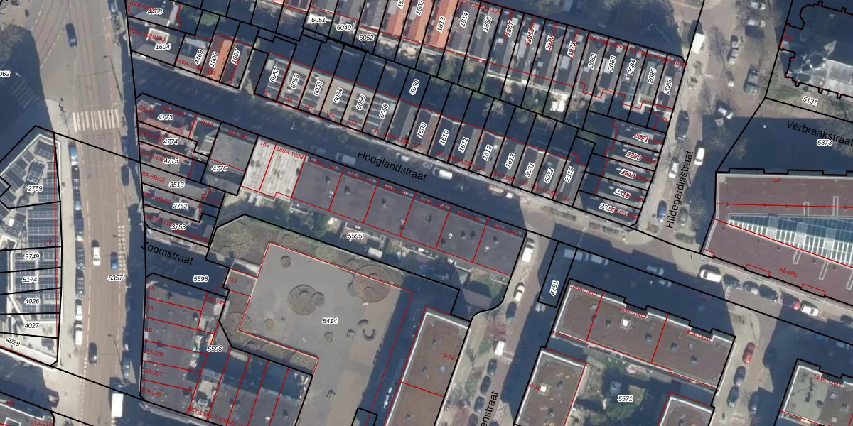 Hooglandstraat 166 is gelegen op kadastraal perceel RTD07W5595. Deze kadastrale aanduiding is uniek en wordt gebruikt door het Kadaster om eigendomsrechten en andere zakelijke rechten vast te leggen. Het perceel maakt onderdeel uit van de kadastrale gemeente Rotterdam.