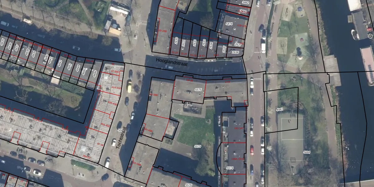 Hooglandstraat 24 is gelegen op kadastraal perceel RTD07W5575. Deze kadastrale aanduiding is uniek en wordt gebruikt door het Kadaster om eigendomsrechten en andere zakelijke rechten vast te leggen. Het perceel maakt onderdeel uit van de kadastrale gemeente Rotterdam.
