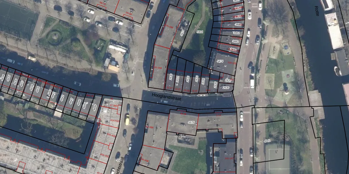 Hooglandstraat 25 is gelegen op kadastraal perceel RTD09Y2631. Deze kadastrale aanduiding is uniek en wordt gebruikt door het Kadaster om eigendomsrechten en andere zakelijke rechten vast te leggen. Het perceel maakt onderdeel uit van de kadastrale gemeente Rotterdam.