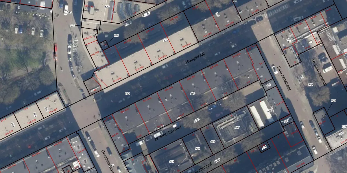 Het perceel waarop Hoogstraat 30-D staat heeft een oppervlakte van 2005 m². Dit is een zeer groot perceel. De perceeloppervlakte wordt geregistreerd door het Kadaster. Gedetailleerde informatie over de maten van dit perceel kunt u vinden in het rapport Kadastrale kaart met maatvoering van Hoogstraat 30-D.