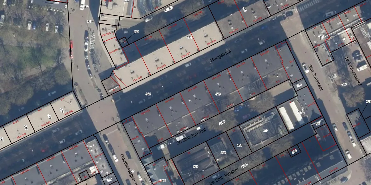 Hoogstraat 32-A is gelegen op kadastraal perceel RTD04AF580. Deze kadastrale aanduiding is uniek en wordt gebruikt door het Kadaster om eigendomsrechten en andere zakelijke rechten vast te leggen. Het perceel maakt onderdeel uit van de kadastrale gemeente Rotterdam.