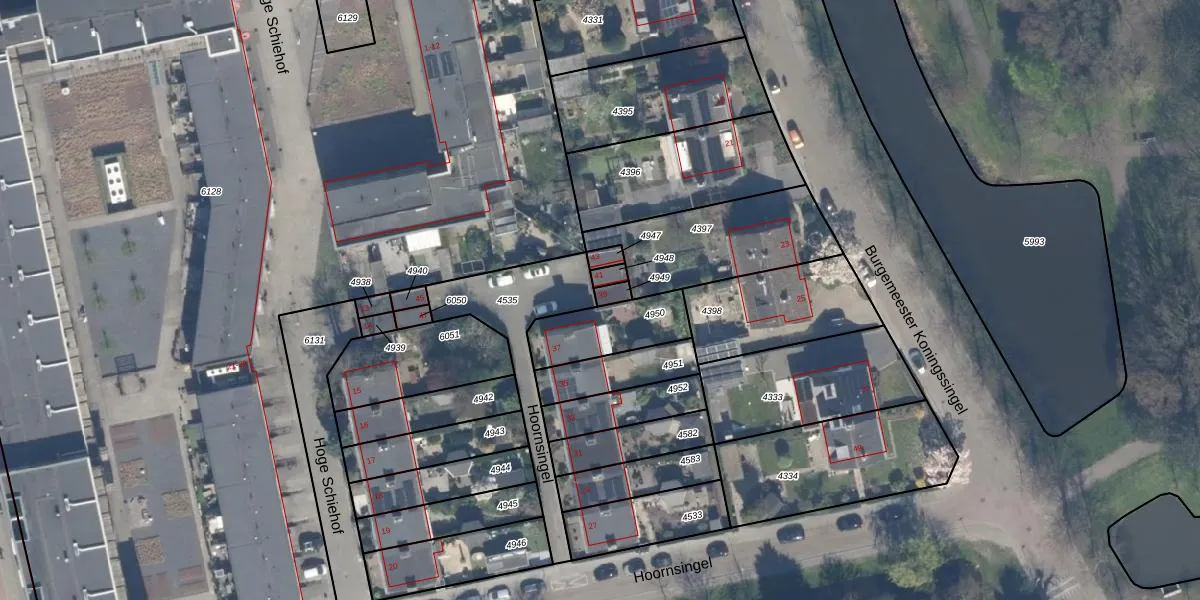 Hoornsingel 39 is gelegen op kadastraal perceel OVS00C4949. Deze kadastrale aanduiding is uniek en wordt gebruikt door het Kadaster om eigendomsrechten en andere zakelijke rechten vast te leggen. Het perceel maakt onderdeel uit van de kadastrale gemeente Overschie.