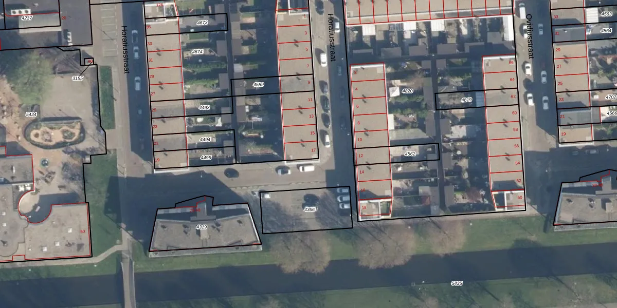 Het perceel waarop Horatiusstraat 17 staat heeft een oppervlakte van 2179 m². Dit is een zeer groot perceel. De perceeloppervlakte wordt geregistreerd door het Kadaster. Gedetailleerde informatie over de maten van dit perceel kunt u vinden in het rapport Kadastrale kaart met maatvoering van Horatiusstraat 17.