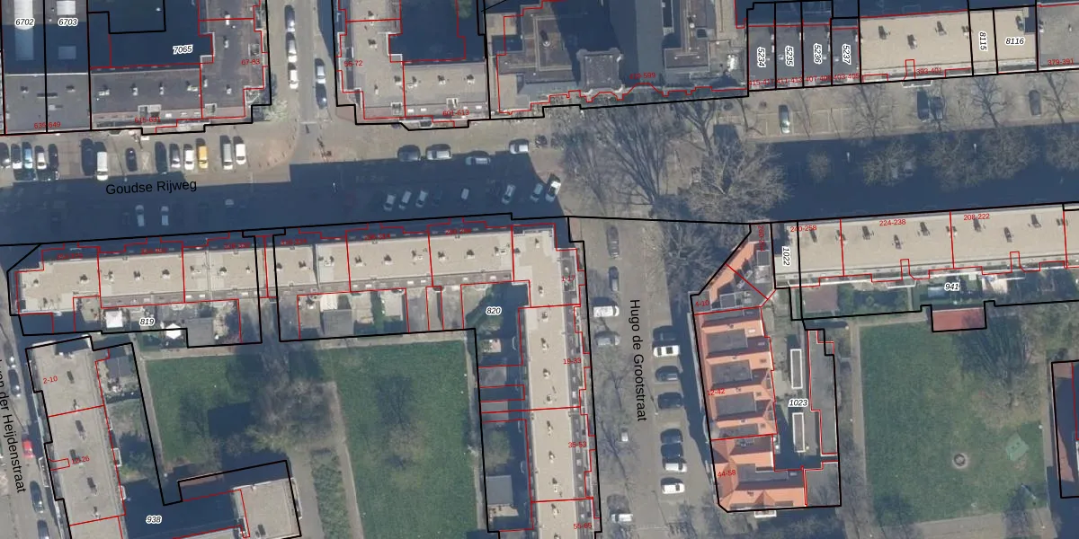 Hugo de Grootstraat 15 is gelegen op kadastraal perceel RTD04AE820. Deze kadastrale aanduiding is uniek en wordt gebruikt door het Kadaster om eigendomsrechten en andere zakelijke rechten vast te leggen. Het perceel maakt onderdeel uit van de kadastrale gemeente Rotterdam.