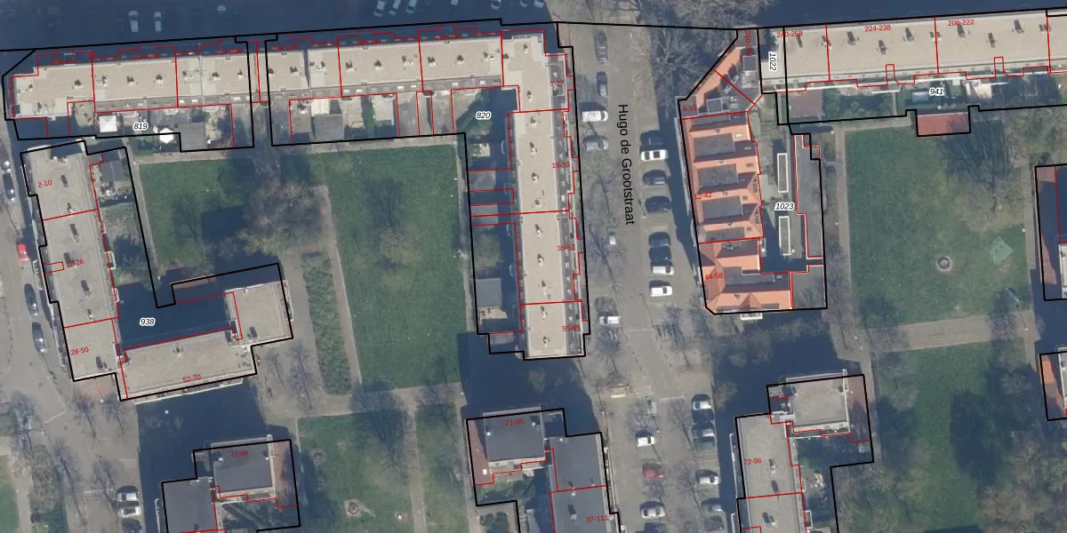 Het perceel waarop Hugo de Grootstraat 47 staat heeft een oppervlakte van 2052 m². Dit is een zeer groot perceel. De perceeloppervlakte wordt geregistreerd door het Kadaster. Gedetailleerde informatie over de maten van dit perceel kunt u vinden in het rapport Kadastrale kaart met maatvoering van Hugo de Grootstraat 47.