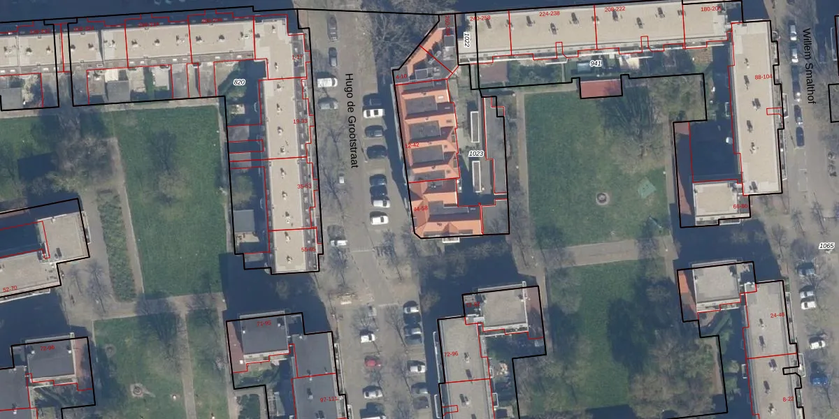 Het perceel waarop Hugo de Grootstraat 48 staat heeft een oppervlakte van 1029 m². Dit is een zeer groot perceel. De perceeloppervlakte wordt geregistreerd door het Kadaster. Gedetailleerde informatie over de maten van dit perceel kunt u vinden in het rapport Kadastrale kaart met maatvoering van Hugo de Grootstraat 48.