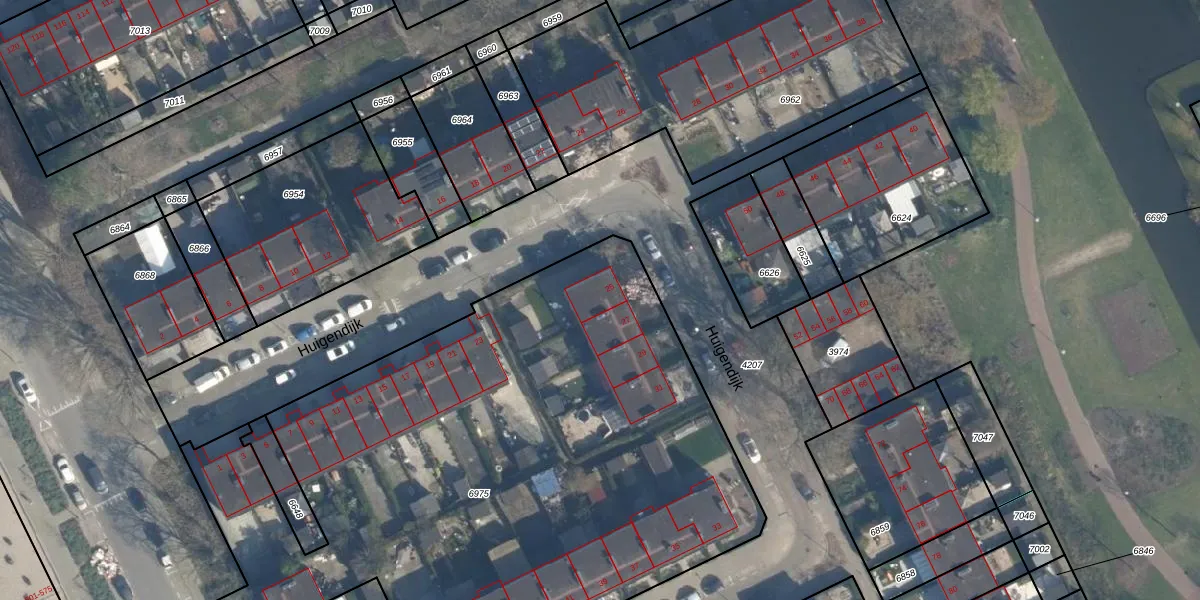 Huigendijk 25 is gelegen op kadastraal perceel ISM01B6975. Deze kadastrale aanduiding is uniek en wordt gebruikt door het Kadaster om eigendomsrechten en andere zakelijke rechten vast te leggen. Het perceel maakt onderdeel uit van de kadastrale gemeente IJsselmonde.