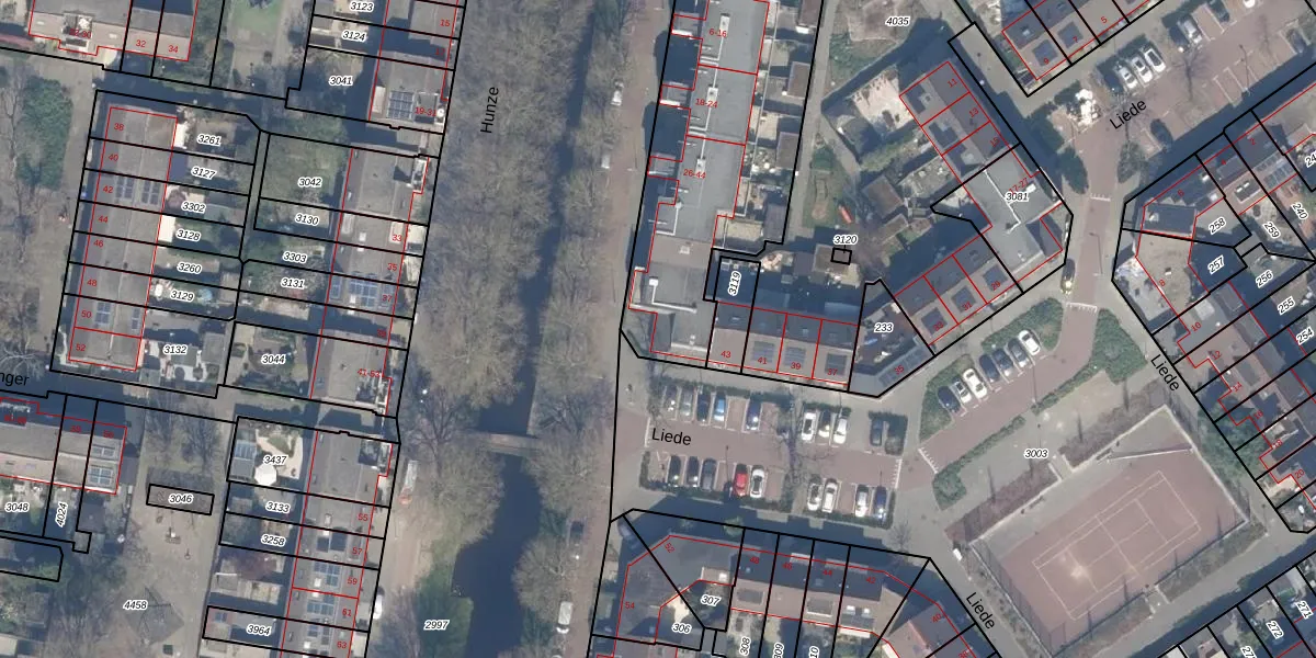 Het perceel waarop Hunze 44 staat heeft een oppervlakte van 2483 m². Dit is een zeer groot perceel. De perceeloppervlakte wordt geregistreerd door het Kadaster. Gedetailleerde informatie over de maten van dit perceel kunt u vinden in het rapport Kadastrale kaart met maatvoering van Hunze 44.
