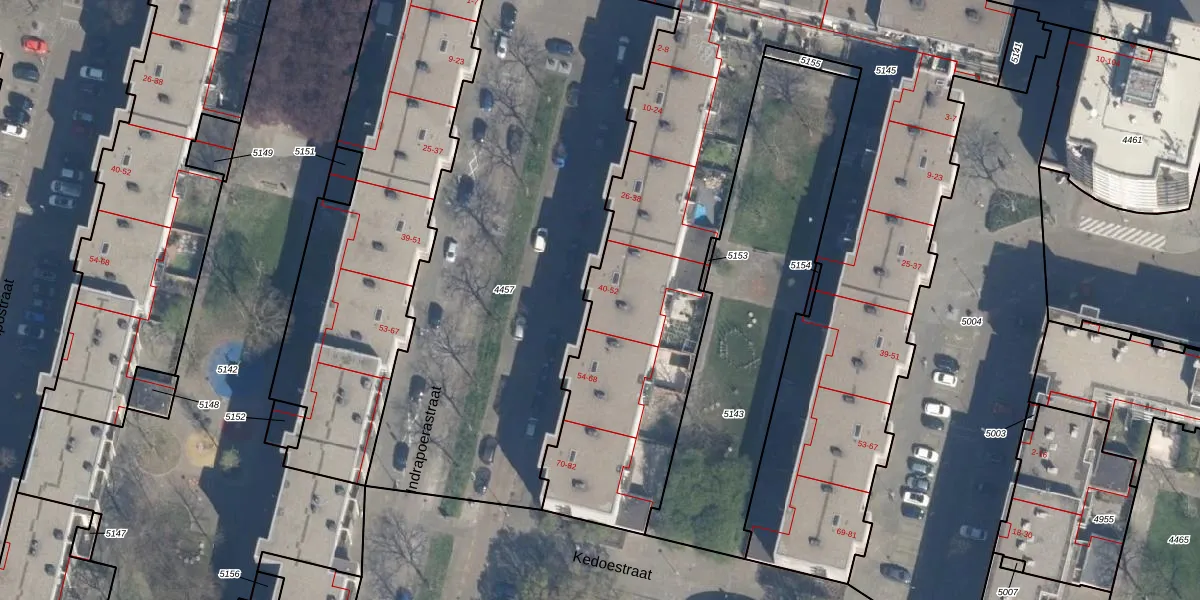 Indrapoerastraat 44 is gelegen op kadastraal perceel DHV00H5145. Deze kadastrale aanduiding is uniek en wordt gebruikt door het Kadaster om eigendomsrechten en andere zakelijke rechten vast te leggen. Het perceel maakt onderdeel uit van de kadastrale gemeente Delfshaven.