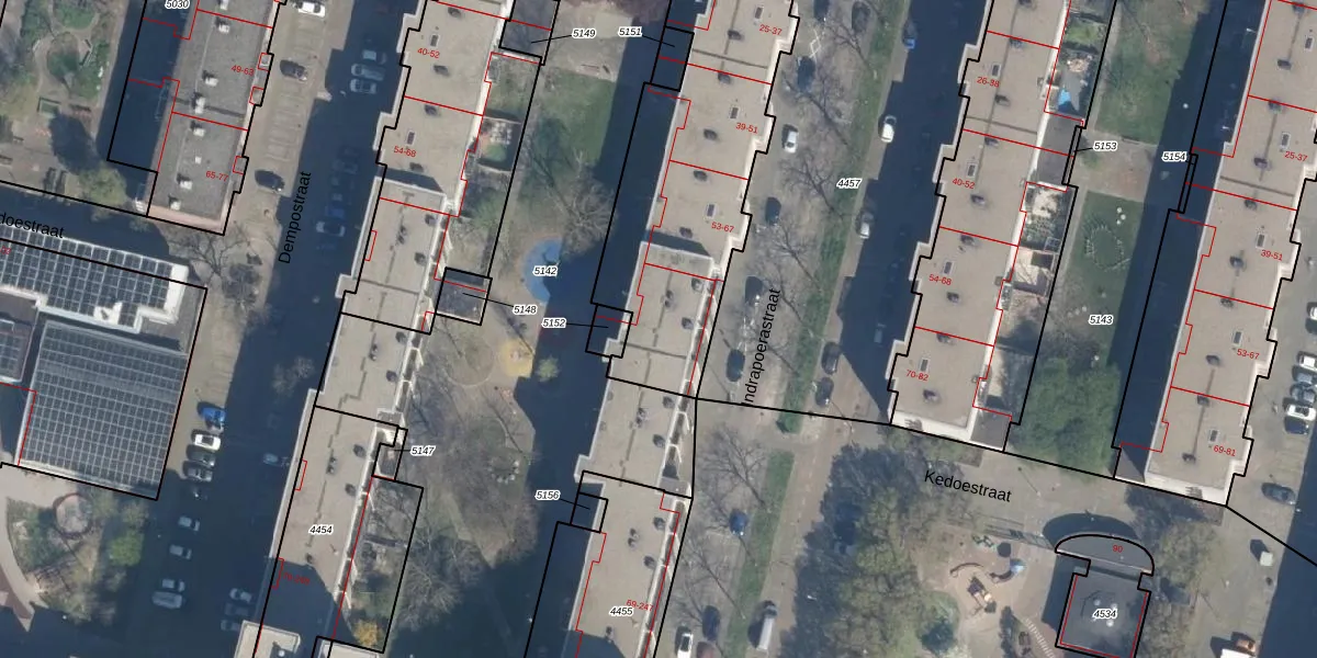 Het perceel waarop Indrapoerastraat 87 staat heeft een oppervlakte van 4115 m². Dit is een zeer groot perceel. De perceeloppervlakte wordt geregistreerd door het Kadaster. Gedetailleerde informatie over de maten van dit perceel kunt u vinden in het rapport Kadastrale kaart met maatvoering van Indrapoerastraat 87.
