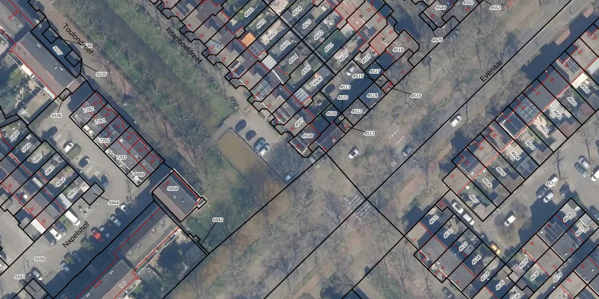 Gebruik de zoekbalk of klik op een perceel voor informatie over de adressen binnen dit perceel.