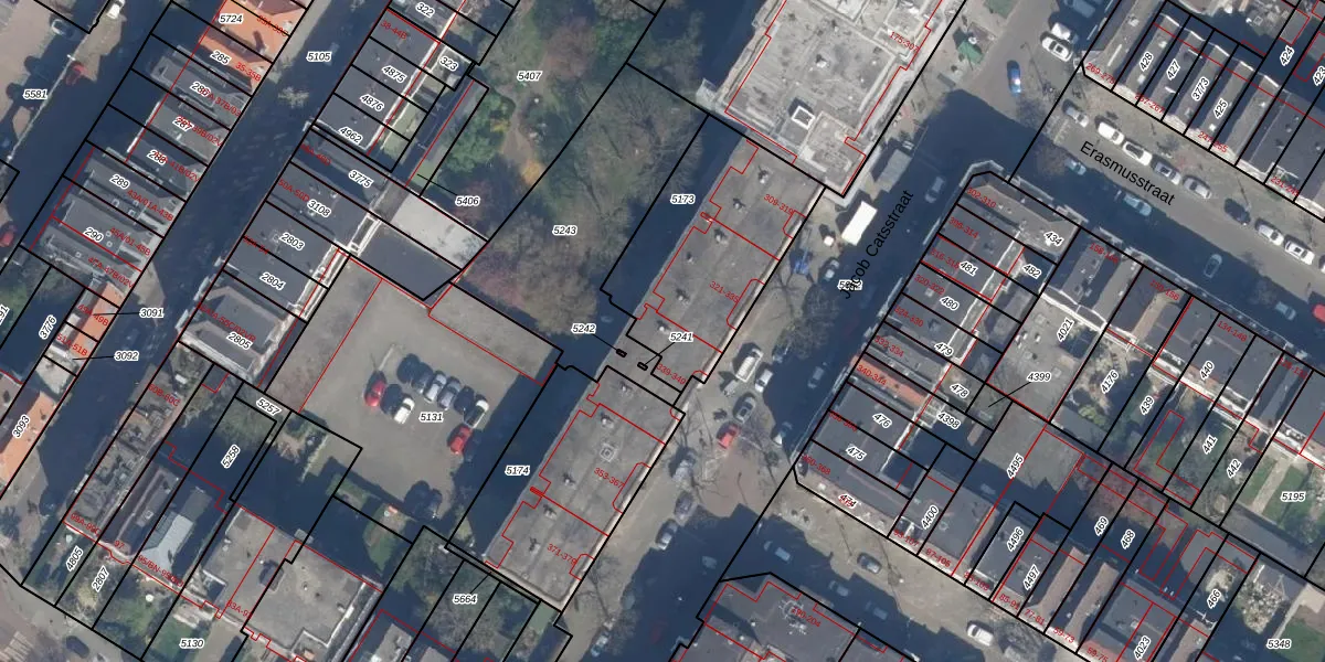 Het perceel waarop Jacob Catsstraat 347 staat heeft een oppervlakte van 724 m². Dit is een groot perceel. De perceeloppervlakte wordt geregistreerd door het Kadaster. Gedetailleerde informatie over de maten van dit perceel kunt u vinden in het rapport Kadastrale kaart met maatvoering van Jacob Catsstraat 347.