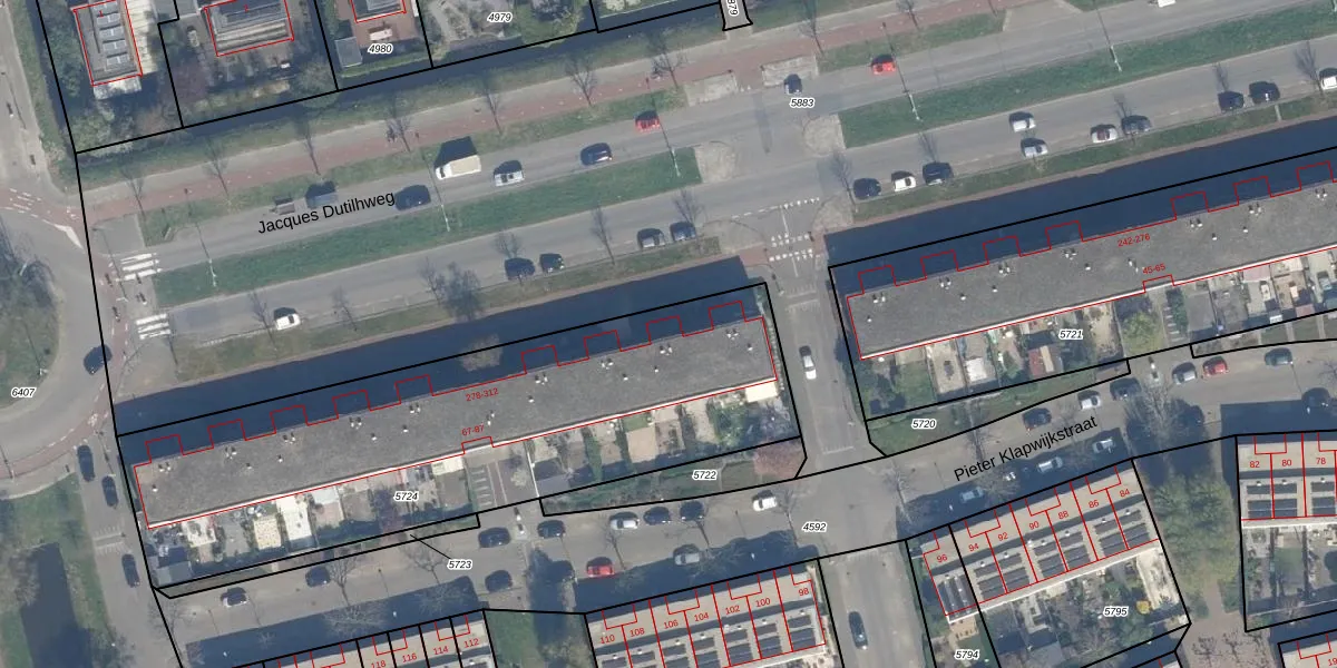 Jacques Dutilhweg 282 is gelegen op kadastraal perceel KLG00C5724. Deze kadastrale aanduiding is uniek en wordt gebruikt door het Kadaster om eigendomsrechten en andere zakelijke rechten vast te leggen. Het perceel maakt onderdeel uit van de kadastrale gemeente Kralingen.