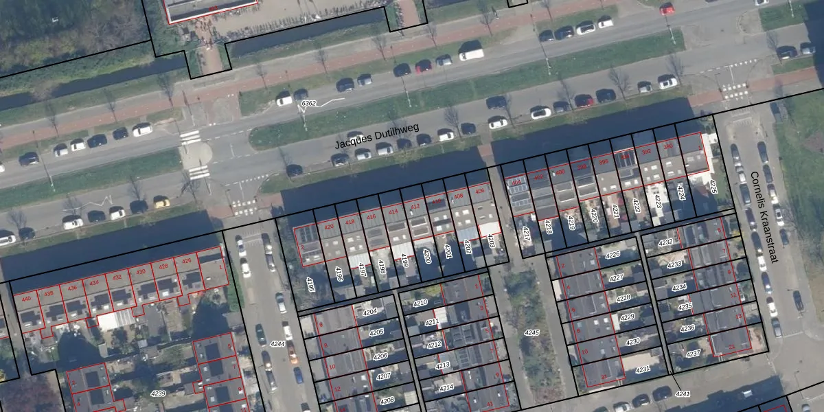 Jacques Dutilhweg 412 is gelegen op kadastraal perceel KLG00C4200. Deze kadastrale aanduiding is uniek en wordt gebruikt door het Kadaster om eigendomsrechten en andere zakelijke rechten vast te leggen. Het perceel maakt onderdeel uit van de kadastrale gemeente Kralingen.