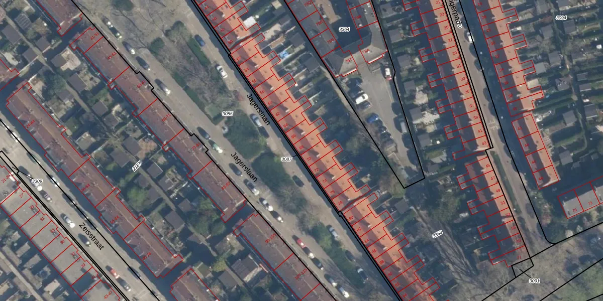 Jagerslaan 68 is gelegen op kadastraal perceel CLS00F3363. Deze kadastrale aanduiding is uniek en wordt gebruikt door het Kadaster om eigendomsrechten en andere zakelijke rechten vast te leggen. Het perceel maakt onderdeel uit van de kadastrale gemeente Charlois.