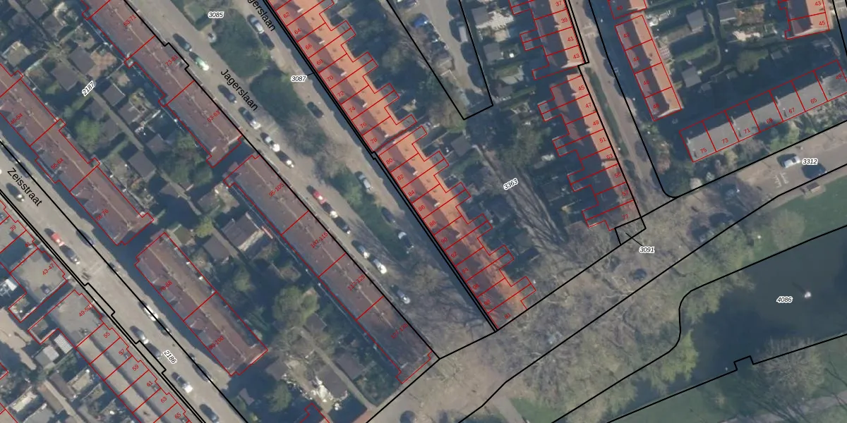 Het perceel waarop Jagerslaan 86 staat heeft een oppervlakte van 9175 m². Dit is een zeer groot perceel. De perceeloppervlakte wordt geregistreerd door het Kadaster. Gedetailleerde informatie over de maten van dit perceel kunt u vinden in het rapport Kadastrale kaart met maatvoering van Jagerslaan 86.