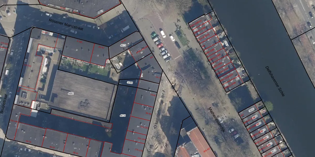 Het perceel waarop het adres ligt is DHV00-H-4674. De afkorting 'DHV00' staat voor kadastrale gemeente Delfshaven. De gemiddelde perceeloppervlakte in de kadastrale gemeente Delfshaven is 628,53 m². Dit perceel is met zijn 3835 m² dus groter dan gemiddeld. De grootste perceeloppervlakte in de kadastrale gemeente is 22,2 ha. De kleinste oppervlakte bedraagt 0 m². Op het perceel liggen in totaal 105 adressen. De huidige grenzen van het perceel zijn digitaal in de Basisregistratie Kadaster (BRK) geregistreerd op 05-03-2009.