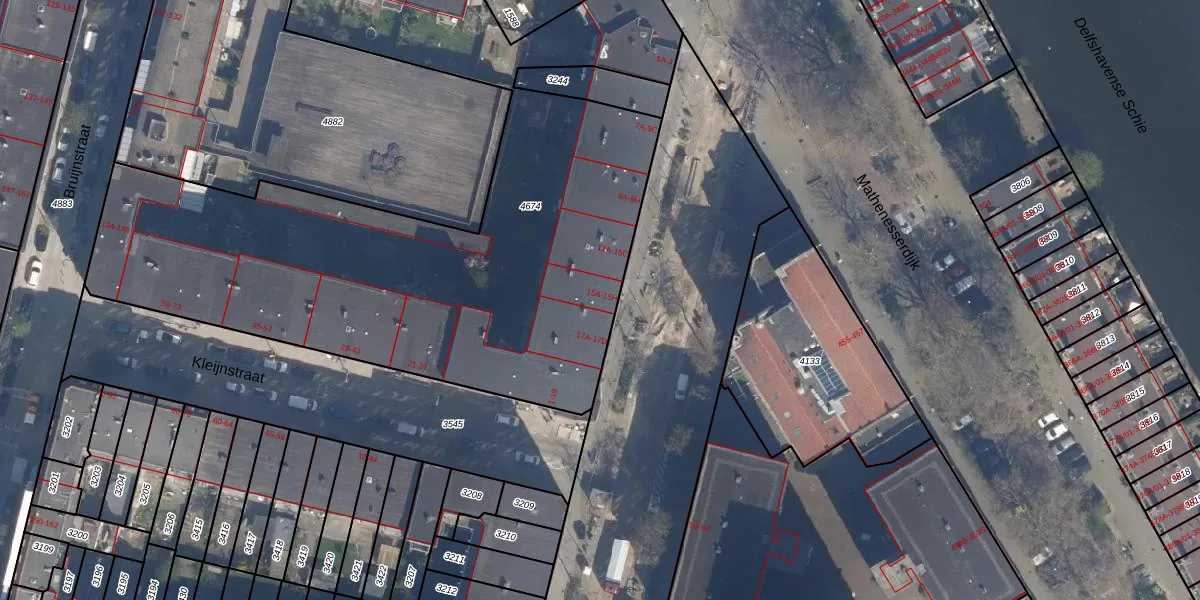 Het perceel waarop het adres ligt is DHV00-H-4674. De afkorting 'DHV00' staat voor kadastrale gemeente Delfshaven. De gemiddelde perceeloppervlakte in de kadastrale gemeente Delfshaven is 628,53 m². Dit perceel is met zijn 3835 m² dus groter dan gemiddeld. De grootste perceeloppervlakte in de kadastrale gemeente is 22,2 ha. De kleinste oppervlakte bedraagt 0 m². Op het perceel liggen in totaal 105 adressen. De huidige grenzen van het perceel zijn digitaal in de Basisregistratie Kadaster (BRK) geregistreerd op 05-03-2009.