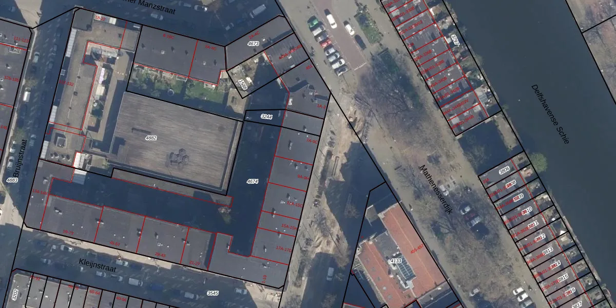 Het perceel waarop het adres ligt is DHV00-H-4674. De afkorting 'DHV00' staat voor kadastrale gemeente Delfshaven. De gemiddelde perceeloppervlakte in de kadastrale gemeente Delfshaven is 628,53 m². Dit perceel is met zijn 3835 m² dus groter dan gemiddeld. De grootste perceeloppervlakte in de kadastrale gemeente is 22,2 ha. De kleinste oppervlakte bedraagt 0 m². Er zijn 105 adressen aanwezig op het perceel. De laatste wijziging in het de Basisregistratie Kadaster (BRK) was op 05-03-2009.