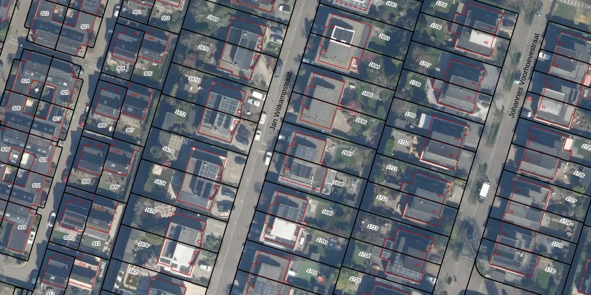 Het perceel waarop Jan Witkampstraat 25 staat heeft een oppervlakte van 350 m². Dit is een groot perceel. De perceeloppervlakte wordt geregistreerd door het Kadaster. Gedetailleerde informatie over de maten van dit perceel kunt u vinden in het rapport Kadastrale kaart met maatvoering van Jan Witkampstraat 25.