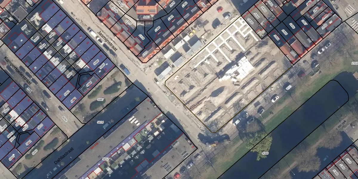 Het perceel waarop Jasmijnstraat 62 staat heeft een oppervlakte van 2335 m². Dit is een zeer groot perceel. De perceeloppervlakte wordt geregistreerd door het Kadaster. Gedetailleerde informatie over de maten van dit perceel kunt u vinden in het rapport Kadastrale kaart met maatvoering van Jasmijnstraat 62.