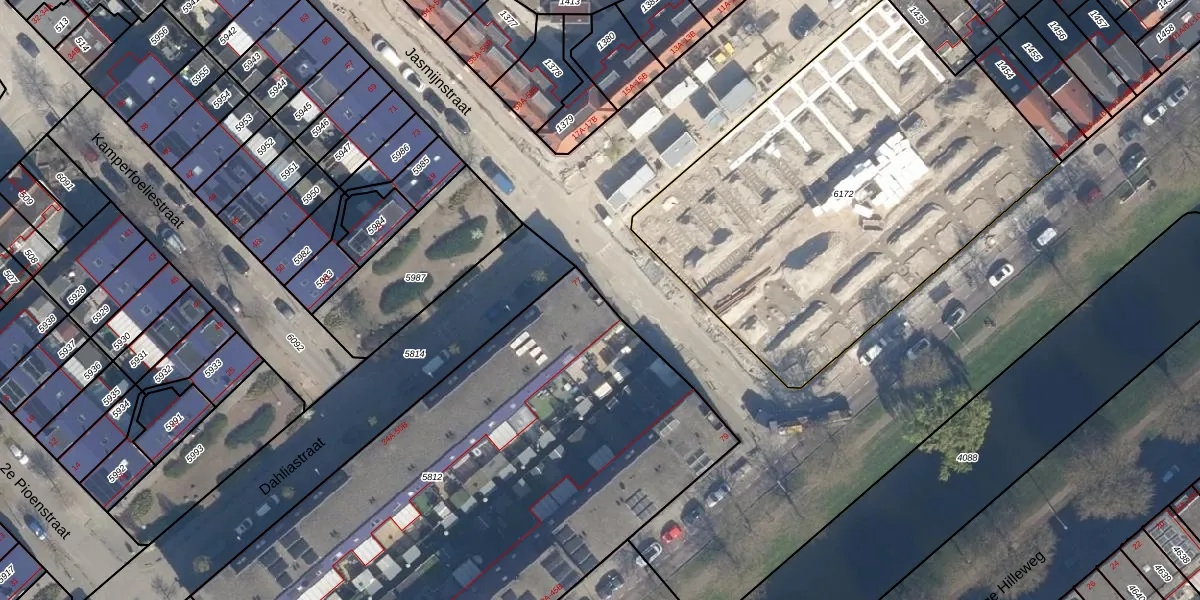 Het perceel waarop Jasmijnstraat 77 staat heeft een oppervlakte van 3415 m². Dit is een zeer groot perceel. De perceeloppervlakte wordt geregistreerd door het Kadaster. Gedetailleerde informatie over de maten van dit perceel kunt u vinden in het rapport Kadastrale kaart met maatvoering van Jasmijnstraat 77.
