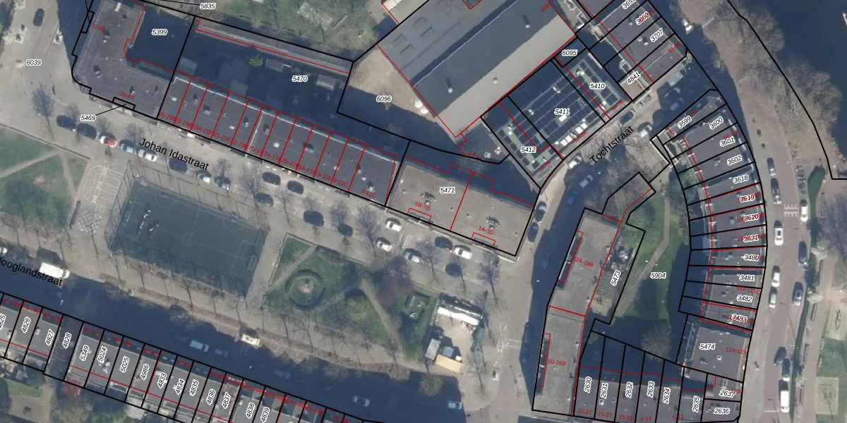 Het perceel waarop Johan Idastraat 5-D staat heeft een oppervlakte van 620 m². Dit is een groot perceel. De perceeloppervlakte wordt geregistreerd door het Kadaster. Gedetailleerde informatie over de maten van dit perceel kunt u vinden in het rapport Kadastrale kaart met maatvoering van Johan Idastraat 5-D.