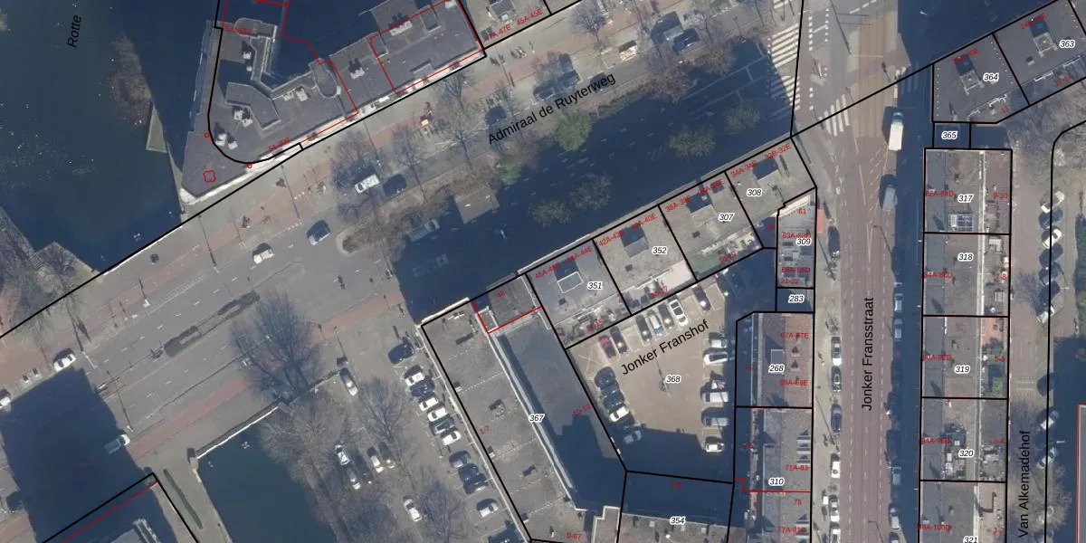 Jonker Franshof 14 is gelegen op kadastraal perceel RTD08AD351. Deze kadastrale aanduiding is uniek en wordt gebruikt door het Kadaster om eigendomsrechten en andere zakelijke rechten vast te leggen. Het perceel maakt onderdeel uit van de kadastrale gemeente Rotterdam.