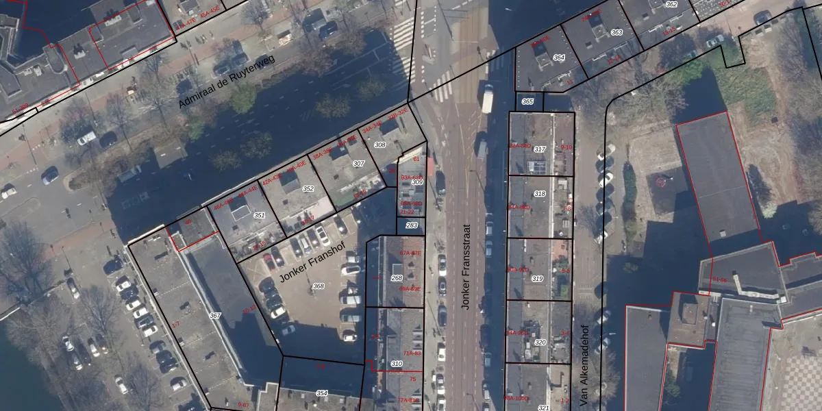 Jonker Franshof 22 is gelegen op kadastraal perceel RTD08AD309. Deze kadastrale aanduiding is uniek en wordt gebruikt door het Kadaster om eigendomsrechten en andere zakelijke rechten vast te leggen. Het perceel maakt onderdeel uit van de kadastrale gemeente Rotterdam.
