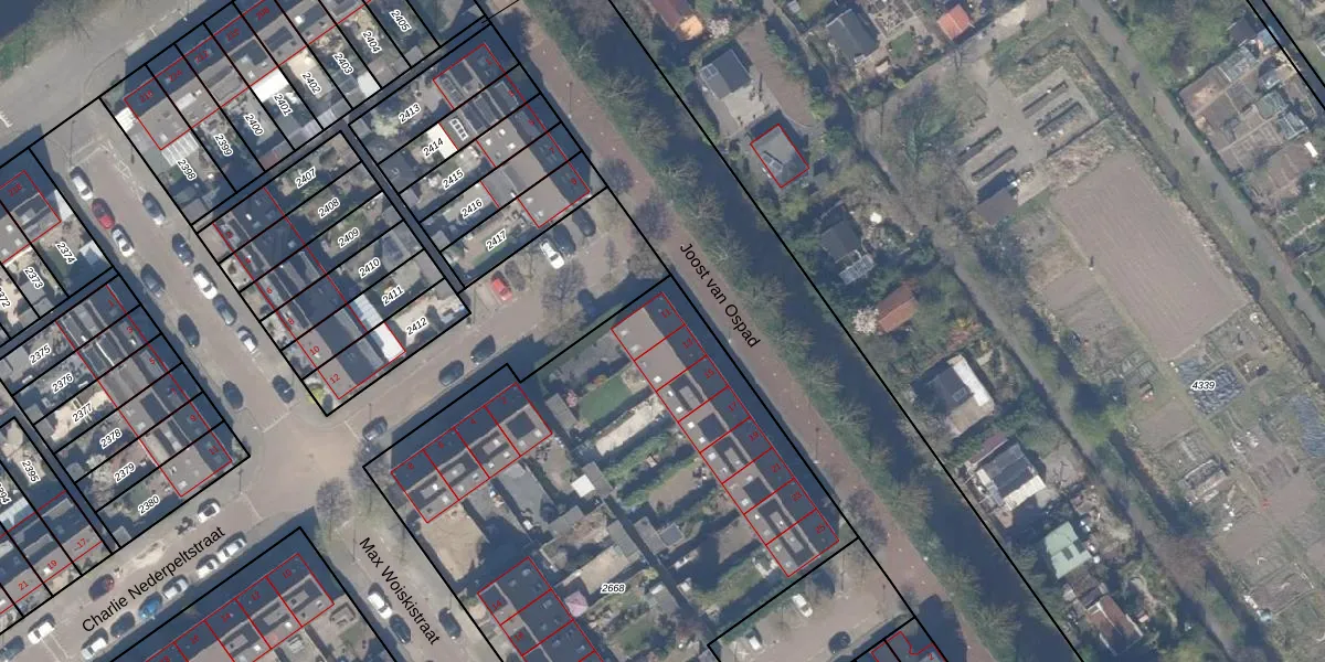 Het perceel waarop Joost van Ospad 11 staat heeft een oppervlakte van 2845 m². Dit is een zeer groot perceel. De perceeloppervlakte wordt geregistreerd door het Kadaster. Gedetailleerde informatie over de maten van dit perceel kunt u vinden in het rapport Kadastrale kaart met maatvoering van Joost van Ospad 11.