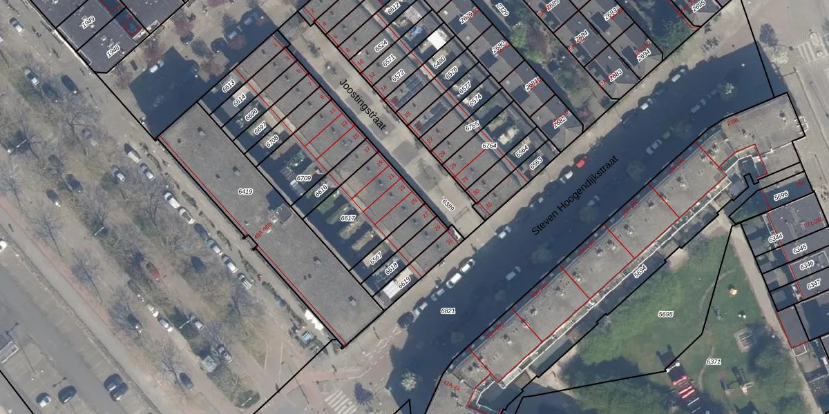 Joostingstraat 25 is gelegen op kadastraal perceel RTD05Q6617. Deze kadastrale aanduiding is uniek en wordt gebruikt door het Kadaster om eigendomsrechten en andere zakelijke rechten vast te leggen. Het perceel maakt onderdeel uit van de kadastrale gemeente Rotterdam.