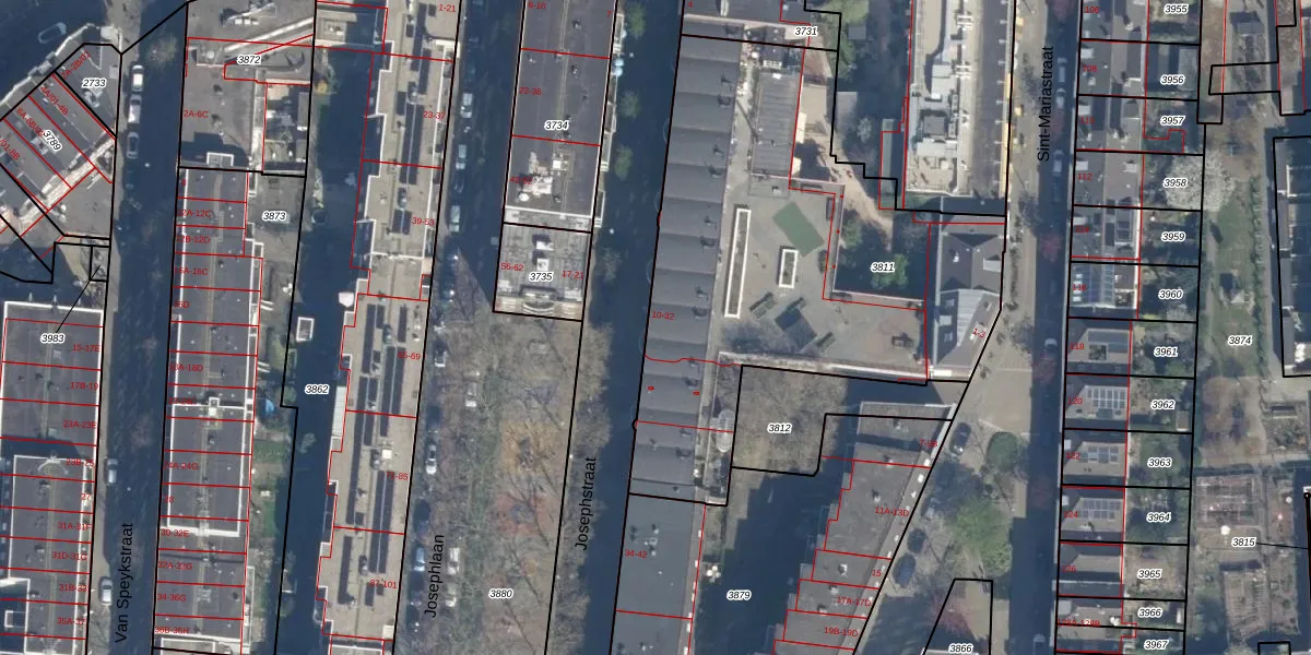 Het perceel waarop Josephstraat 14 staat heeft een oppervlakte van 2322 m². Dit is een zeer groot perceel. De perceeloppervlakte wordt geregistreerd door het Kadaster. Gedetailleerde informatie over de maten van dit perceel kunt u vinden in het rapport Kadastrale kaart met maatvoering van Josephstraat 14.