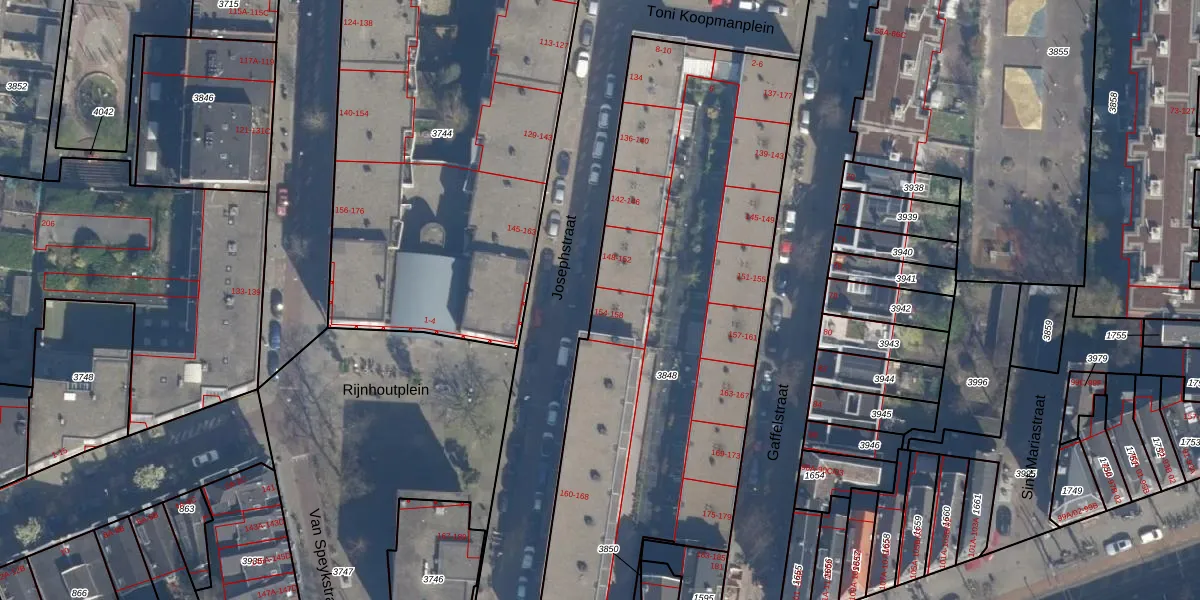 Het perceel waarop Josephstraat 154 staat heeft een oppervlakte van 2770 m². Dit is een zeer groot perceel. De perceeloppervlakte wordt geregistreerd door het Kadaster. Gedetailleerde informatie over de maten van dit perceel kunt u vinden in het rapport Kadastrale kaart met maatvoering van Josephstraat 154.