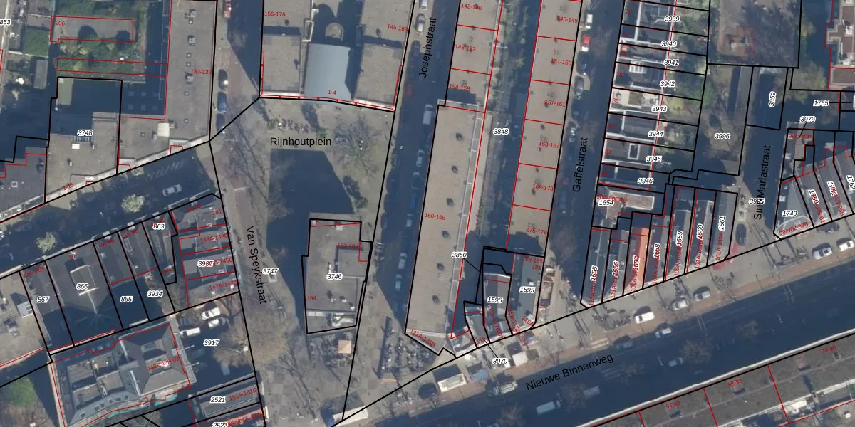 Josephstraat 166 is gelegen op kadastraal perceel DHV00D3848. Deze kadastrale aanduiding is uniek en wordt gebruikt door het Kadaster om eigendomsrechten en andere zakelijke rechten vast te leggen. Het perceel maakt onderdeel uit van de kadastrale gemeente Delfshaven.