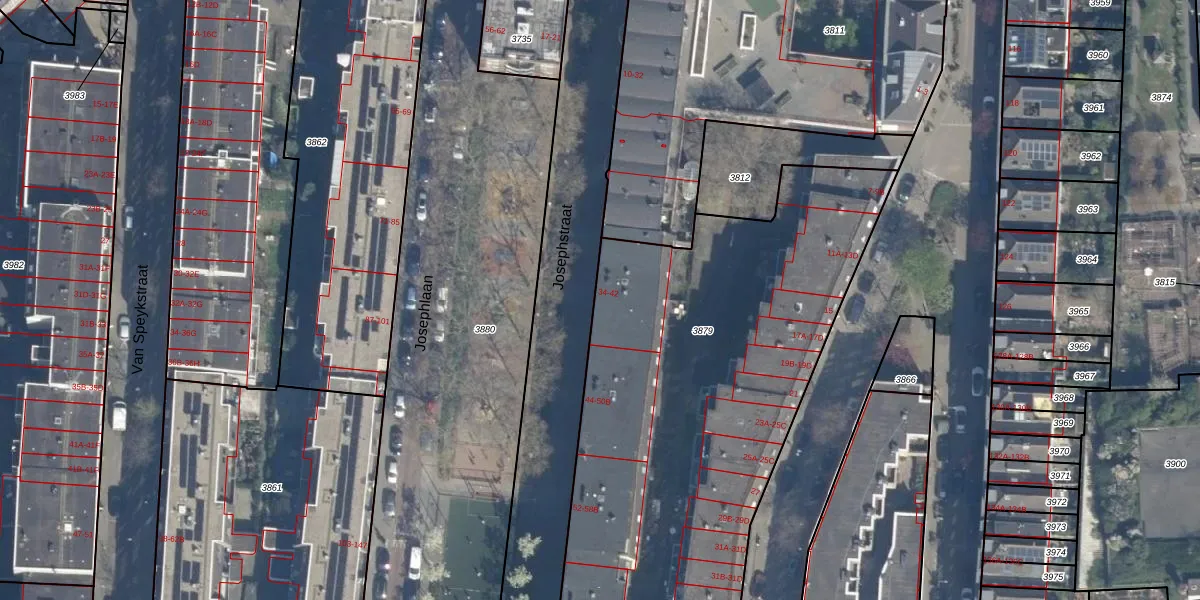 Het perceel waarop Josephstraat 40-A staat heeft een oppervlakte van 2752 m². Dit is een zeer groot perceel. De perceeloppervlakte wordt geregistreerd door het Kadaster. Gedetailleerde informatie over de maten van dit perceel kunt u vinden in het rapport Kadastrale kaart met maatvoering van Josephstraat 40-A.