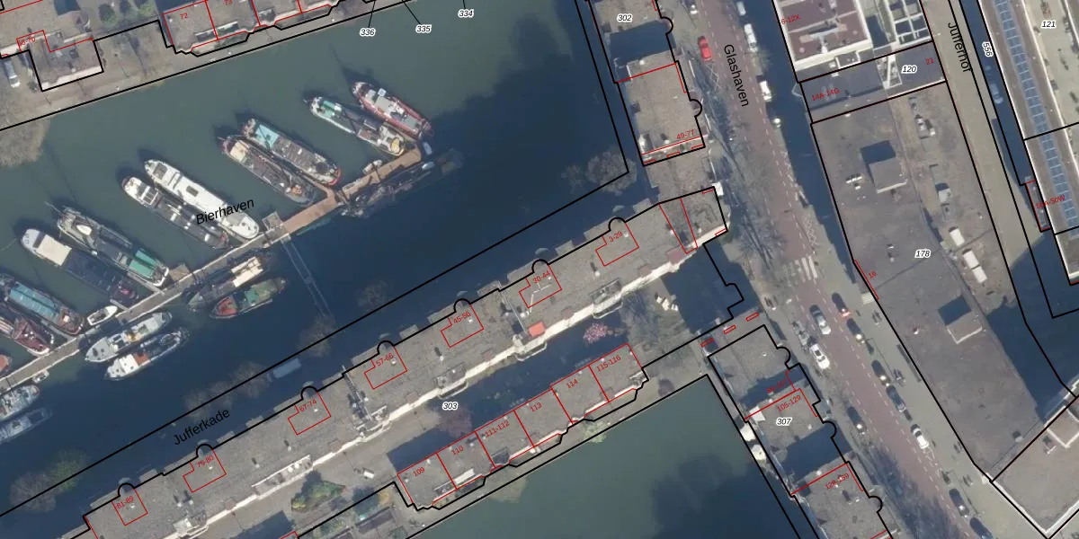 Jufferkade 44 is gelegen op kadastraal perceel RTD04AH303. Deze kadastrale aanduiding is uniek en wordt gebruikt door het Kadaster om eigendomsrechten en andere zakelijke rechten vast te leggen. Het perceel maakt onderdeel uit van de kadastrale gemeente Rotterdam.