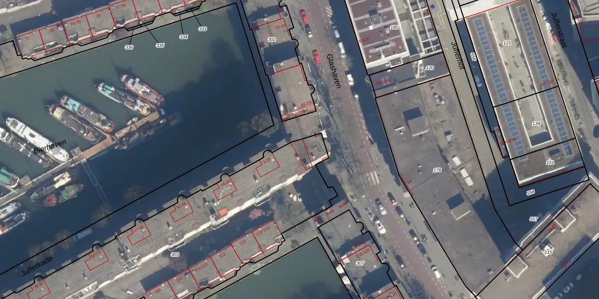 Jufferkade 5 is gelegen op kadastraal perceel RTD04AH303. Deze kadastrale aanduiding is uniek en wordt gebruikt door het Kadaster om eigendomsrechten en andere zakelijke rechten vast te leggen. Het perceel maakt onderdeel uit van de kadastrale gemeente Rotterdam.