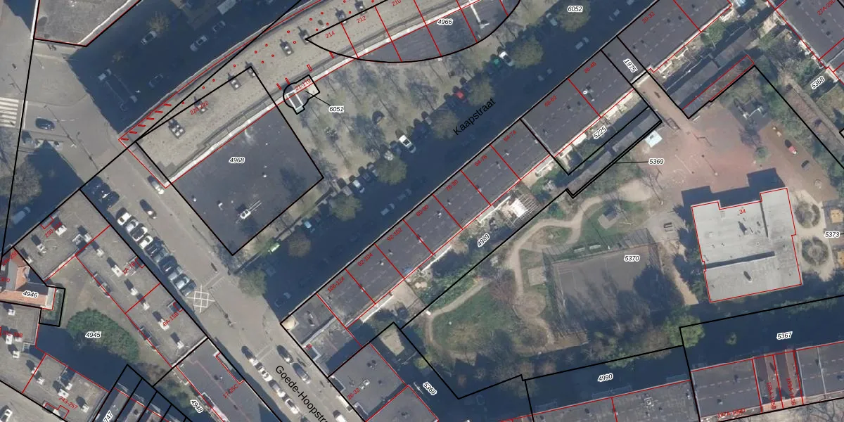 Kaapstraat 90 is gelegen op kadastraal perceel CLS00G4989. Deze kadastrale aanduiding is uniek en wordt gebruikt door het Kadaster om eigendomsrechten en andere zakelijke rechten vast te leggen. Het perceel maakt onderdeel uit van de kadastrale gemeente Charlois.